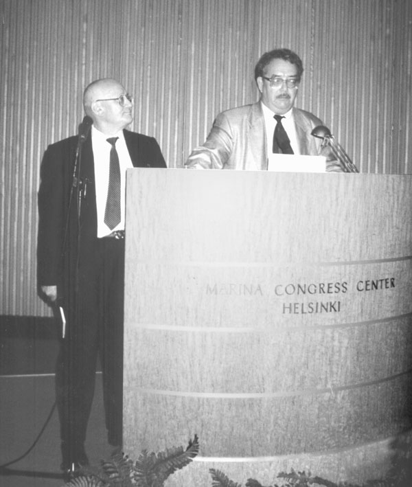 На трибуне Всемирного конгресса писателей в Хельсинки президент Татарского ПЕН-центра Туфан Миннуллин. С татарского на английский язык его выступление переводит Вахит Юнус (1998)