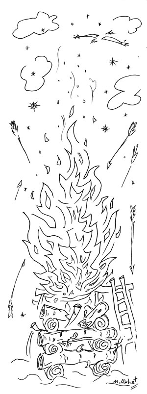 Короткий зимний день уже погас, а ещё и половины пути не пройдено. Она всё шла и шла, пока к полуночи не вышла на широкий простор. Вдали, посреди долины, горел, рассыпая искры, огромный костёр. Женщина остановилась. Чёрные клубы дыма вперемешку с красновато-жёлтыми языками пламени волнами устремлялись кверху. «Там горит что-то!» – подумала Сылукыз, и ей вдруг стало очень страшно.