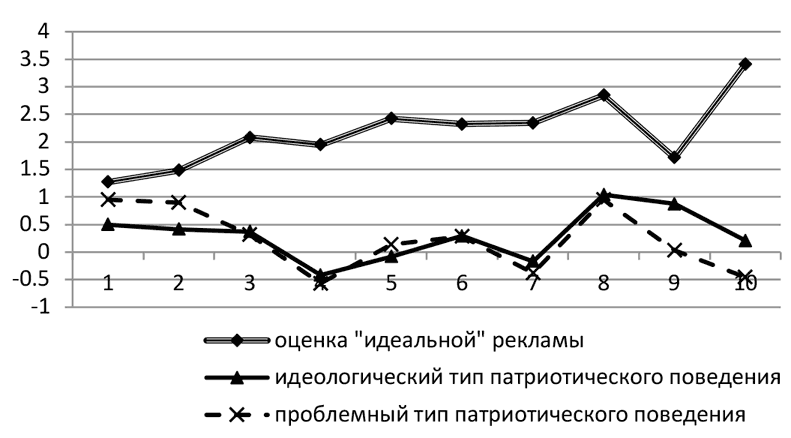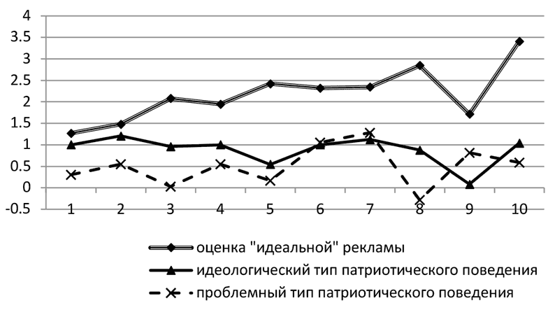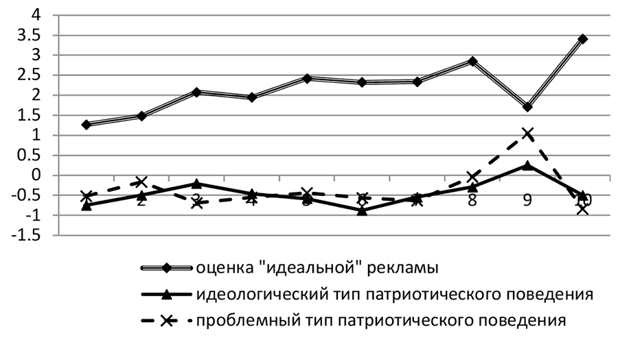 На графиках на рисунках 1–3 представлены результаты оценки коммерческой, политической и социальной рекламы респондентами с преобладанием идеологического и проблемного типа патриотического поведения как противоположных по своим социально-психологическим характеристикам.