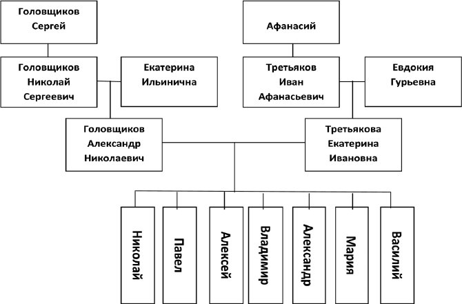Алексей – 1861 г. р. Получил личное почетное гражданство. Девятнадцати лет – 19 января 1881 г. – обвенчался с дочерью крестьянина сельца Боброкова Василия Кирилова – Натальей Васильевной, 18-ти лет. Поручителями по жениху стали его старшие братья Николай и Павел, а по невесте – «крестьяне сельца Боброкова Василий Александров и Митрофан Герасимов»[208]. 13 сентября 1881 г. у супругов родился сын Дмитрий. На следующий день в церкви села Никольского Ушакова Мышкинского уезда младенца крестили. Его восприемниками записаны Александр Николаевич Головщиков (дедушка) и личная гражданка Анна Александрова Головщикова[209].
