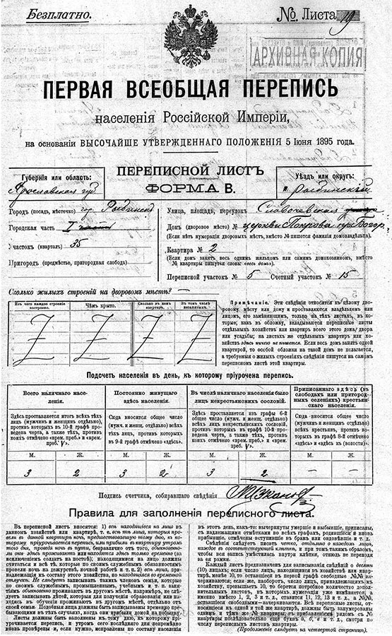 Через 12 лет Василий Иоаннович назначается диаконом Покровской церкви[59] в городе Рыбинске, а позднее – Рыбинского Софийского монастыря[60]. В 1897 г. он был награжден за труды по первой всеобщей переписи населения бронзовой медалью. Проводилась перепись в течение одного дня по всей империи, большей частью, силами священнослужителей (людей грамотных). Благодаря этому данная перепись в отличие от переписей, например, раннего советского периода, считается наиболее достоверной. Такой же медалью за безвозмездную работу переписчика были награждены многие известные люди того времени, например, Антон Павлович Чехов.