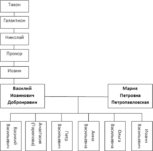 Крестными родителями Константина Васильевича Добронравина были «Рыбинского Софийского женского монастыря дьякон Василий Иванов Добронравин и дочь его девица Ольга Васильева Добронравина»[64] (дедушка и тетя). Известно, что Константин Васильевич жил в Ленинграде, погиб в начале Великой Отечественной войны.