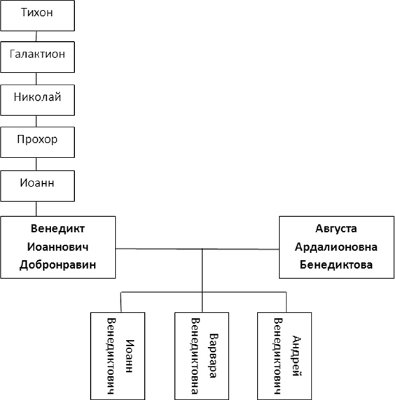 Иоанн Венедиктович – 1868 года рождения. Окончив губернскую земскую фельдшерскую школу, стал фельдшером при Любимской земской больнице. В 1895 г. им получено свидетельство на потомственное почетное гражданство. Последние годы своей жизни служил фельдшером в Рыбинской тюрьме. Умер девятого июня 1914 г. в г. Рыбинске. Его жена – дворянка Жадовская Елизавета Михайловна. Родители Елизаветы – потомственные дворяне Михаил Семенович Жадовский (04.03.1835 – 29.07.1902) и Анастасия Ивановна. В Любимском уезде у Жадовских было родовое имение. Семеро детей было в семье: Евгений, Зинаида, Калерия, Михаил, Александр, Николай, Пантелеймон (Павел). Потомки Иоанна Венедиктовича (Добронравины, Борисовы) живут на Алтае, во Владивостоке и в Санкт-Петербурге.