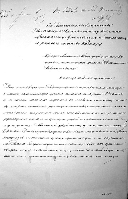 Дочь моя Варвара Добронравина, лишившаяся матери 3-х лет, в настоящее время имеет от роду 11 лет, и в этом нежном возрасте в особенности нуждается в мягком женском руководительстве, между тем как у меня никого из родных нет, кто бы мог жить у меня и руководить ею, а от прислуги грубой и невежественной чему научится? В такой крайности припадаю к стопам Вашего Высокопреосвященства всемилостивейший Архипастырь и нижайше прошу принять дочь мою в устроенное Вами Епархиальное женское училище. При сем прилагая свидетельства: метрическое и о моей бедности, имею честь почтительнейше уведомить, что город Любим принадлежит к Ярославскому училищному округу.