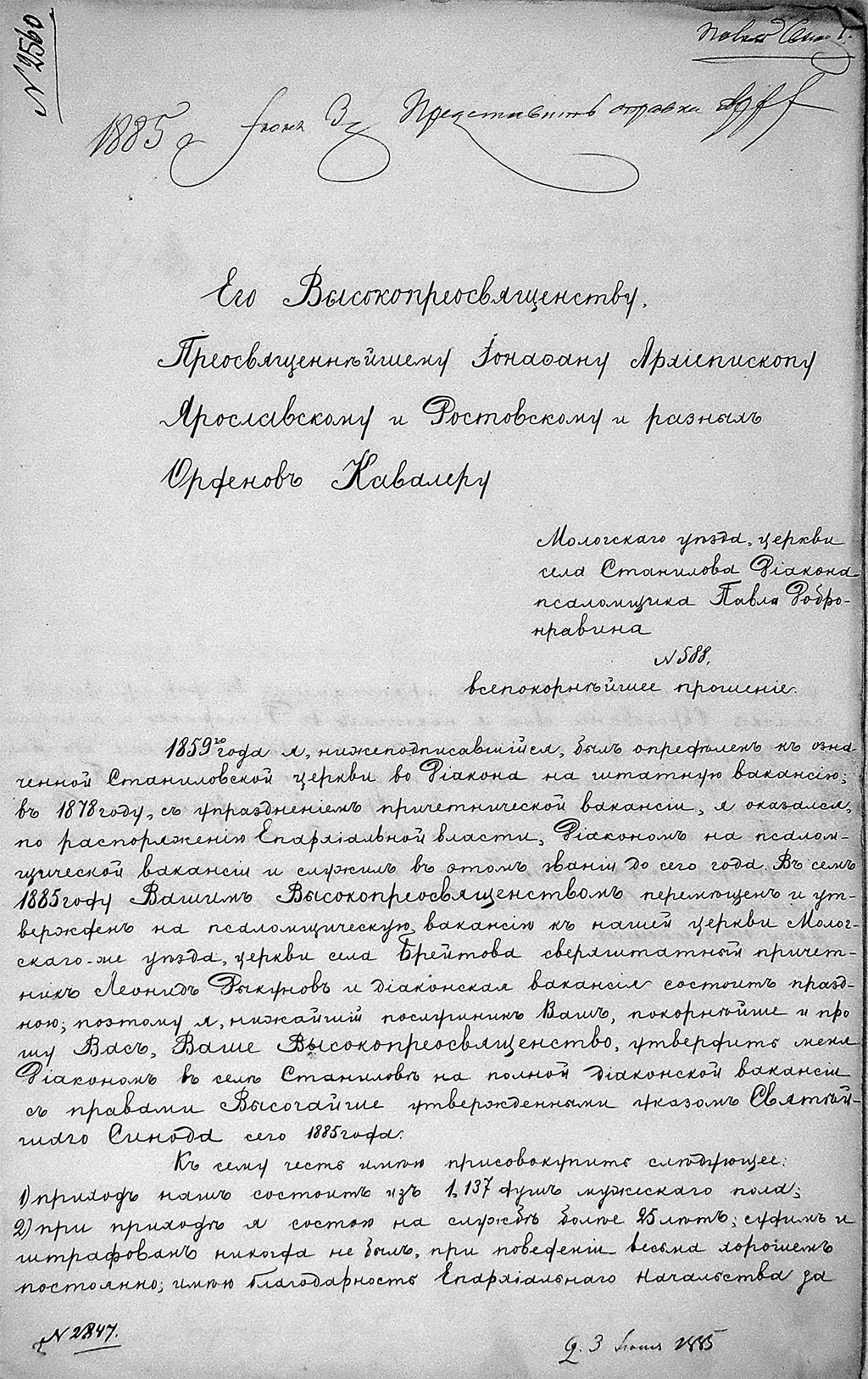 Прошу дать образование дочери моей Аполлинарии Добронравиной… Покорнейше прошу Вас, Ваше Высокопреосвященство, допустить ее до приемных испытаний и зачислить в число воспитанниц Епархиального Женского училища, если она окажется того достойной. Имею честь присовокупить, что село Станилово принадлежит к Угличскому училищному округу Епархии.