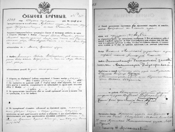 «Обыск брачный № 25 1899 года августа тридцатого дня. По указу Его Императорского Величества Ярославской епархии, Мологского уезда, церкви Преображения Господня в селе Станилове священно-и церковнослужители произвели обыск о желающих вступить в брак, и оказалось следующее: 1) Жених Дмитрий Павлов Соколов, учитель Мологской церковно-приходской школы, сын диакона села Веретеи Мологского уезда Павла Андреева Соколова и его жены Анны Егоровой; холост. Жительствует в г. Молога Ярославской губернии. 2) Невеста Аполлинария Павлова Добронравина, дочь местного диакона Павла Иоаннова Добронравина и жены его Марии Владимировой, девица. Жительствовала доныне в доме своего родителя. 3) Возраст к супружеству имеют совершенный, а именно: жених 26 лет, а невеста 24 года, и оба находятся в здравом уме. 4) Родства между ними духовного, или плотского родства и свойства, возбраняющего по установлению Св. церкви брак, никакого нет. 5) Жених холост, невеста девица. 6) К бракосочетанию приступают они по своему взаимному согласию и желанию, а не по принуждению…»
