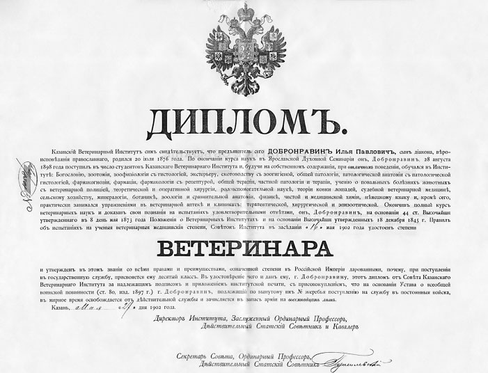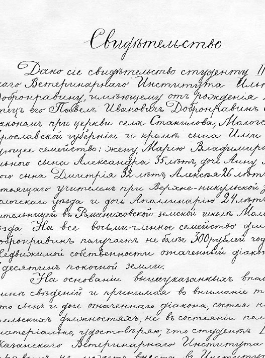 «Свидетельство. Дано сие свидетельство студенту II курса Казанского Ветеринарного Института, Илье Павловичу Добронравину, имеющему от рождения 23 года. Отец его Павел Иванович Добронравин 61 года состоит диаконом при церкви села Станилова, Мологского уезда, Ярославской губернии и кроме сына Ильи имеет следующее семейство: жену Марию Владимирову 61 года, душевнобольного сына Александра 35 лет, дочь Анну 34 лет, глухонемого сына Дмитрия 32 лет, Алексея 26 лет, женатого и состоящего учителем при Верхненикульской земской школе Мологского уезда, и дочь Аполлинарию 24 лет, состоящую учительницей в Романиховской земской школе Мологского же уезда. На все восьми-членное семейство диакон Павел Добронравин получает не более 300 рублей годового дохода. Недвижимой собственности означенный диакон имеет 7 десятин покосной земли. На основании вышеуказанных вполне известных мне сведений и принимая во внимание те обстоятельства, что сын и дочь означенного диакона, состоя на бедных учительских должностях, не в состоянии помогать отцу материально, удостоверяю, что студент II курса Казанского Ветеринарного Института Илья Павлович Добронравин не может внести в Институт платы за слушание лекций в Институте за первое полугодие наступающего 1899/1900 учебного года. И.д. благочинного, Мологского уезда, церкви села Марьино Священник Полиен Никольский. 27 августа 1899 г.»