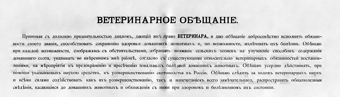Принимая с должною признательностью диплом, дающий мне право ветеринара, я даю обещание добросовестно исполнять обязанности своего звания, способствовать сохранению здоровья домашних животных и, по возможности, излечивать их болезни. Обещаю при каждой возможности, соображаясь с обстоятельствами, обращать внимание сельских хозяев на улучшение способов содержания домашнего скота, указывать во вверенном мне районе, согласно с существующими относительно ветеринарных обязанностей постановлениями, на мероприятия по предохранению и пресечению повальных болезней домашних животных. Обещаю усердно действовать, при помощи указываемых наукою средств, к усовершенствованию скотоводства в России. Обещаю следить за ходом ветеринарных наук и всеми силами содействовать как их усовершенствованию, так и напечатыванием всего замечательнаго, распространять общеполезные сведения, касающиеся до домашних животных и обхождении с ними при здоровом и болезненном их состоянии»