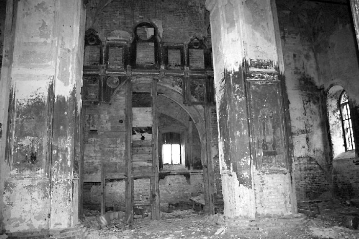 Покосившиеся остатки когда-то богато украшенного иконостаса зияют пустотой. Над входом в храм с внешней стороны висела икона Преображения. Говорят, ее расстреляли. Да как же это? Не могло в сознании верующего человека того времени уместиться такое кощунство! С древних времен на Руси было принято трепетно-уважительное отношение к иконам. Не полагалось даже говорить «принесли икону», «украли икону», но – «икона пришла», «икона ушла». Так же невозможно было произнести «продать икону», речь ведь идет о святом предмете. А тут – расстреляли…
