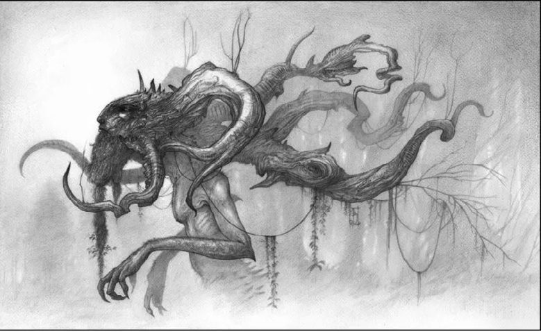 В какой-то день Вукол пришел домой и услышал какие-то шаги. Осмотрев свой дом, он ничего не нашел. Он решил снова спуститься в этот проклятый подвал. Спустился и увидел, что все лежит, как и раньше, но начав смотреть старые чертежи, он увидел очень странные и непонятные рисунки. Там были нарисованы какие-то не похожие на земные существа. Их было очень много. Они лежали чисто, как будто кто-то их положил и ушел.