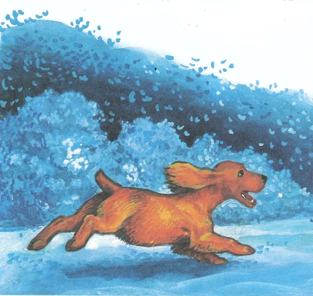 А Проша мчался по дороге. Уши его, как крылья, развевались по ветру. От быстрого бега он разгорячился, но бежал всё медленнее, начиная уставать. Он вдруг совсем остановился, почувствовав, что больше бежать не может. Сел на задние лапы, а снежинки, тихо кружась, падали и падали с неба.