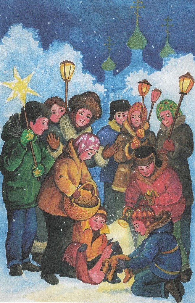 Где-то на соседней улице послышалось пение старинных рождественских колядок. Из-за угла вышла группа ребят–Христославов из местной Воскресной школы вместе со своей преподавательницей Анной Дмитриевной. У них в руках на небольших деревянных шестах были разноцветные стеклянные фонарики, в которых горели свечи, красивая Вифлеемская звезда, сделанная из серебристой фольги. У одного из ребят была корзинка со сладостями, которыми угощали Христославов.
