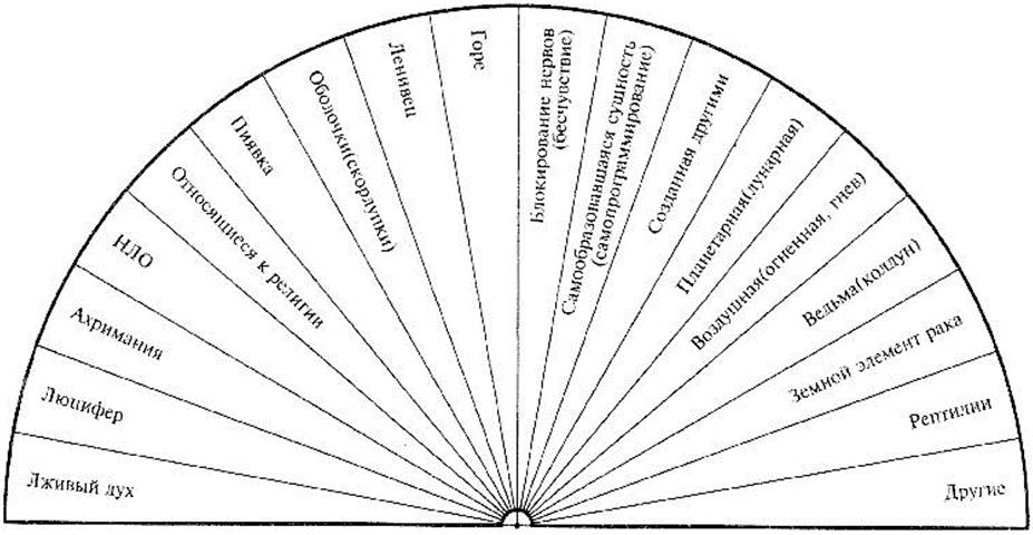 Мандала снова помещается в верхней части диаграммы, создается фантом аналогично вышеописанному и задается вопрос: «Какая первая сущность находится в моей ауре и вызывает болезненное состояние моего организма?» Маятник покажет сектор с определенной сущностью. Записываем ее название, например, «горе». Следующий вопрос: «Какая вторая сущность содержится в моей ауре и вызывает болезненное состояние моего организма?» Точно так же определяется сектор со второй сущностью. Фиксируем ее, например, «самообразовавшаяся сущность».