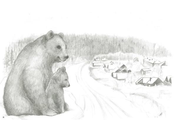 «Придётся идти к деревне, там можно будет чем-то полакомиться», – подумала медведица. Затея эта ей не очень нравилась, но и бродить голодными по лесу не хотелось.