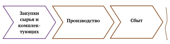 также зависит от типа интеграции закупочного процесса в цепочку создания стоимости компании или, говоря другими словами, в процессную модель компании. Например, закупки могут быть интегрированы в основную технологическую цепочку, как показано на рис. 1. Стратегический тип закупок