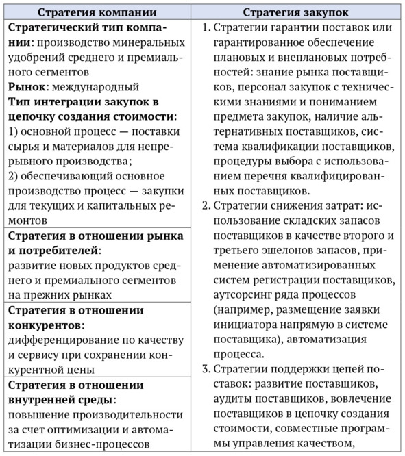 Очевидно, что стратегия закупок как одна из функциональных стратегий должна соответствовать стратегии компании. Для удобства можно описывать стратегию закупок по шести направлениям, приведенным в предыдущем разделе. Для формирования стратегии закупок можно использовать стратегическую карту, как показано для примера в таблице 1.