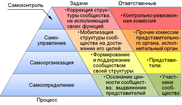 Самоуправляемое сообщество невозможно без освоения процессов, дающих ему самостоятельность. Они представляют собой иерархию, где освоение предыдущего есть база следующего. Сообщество самоуправляемо, если работают все процессы. У каждого из них свои задачи, за которые отвечает соответствующий структурный уровень сообщества: