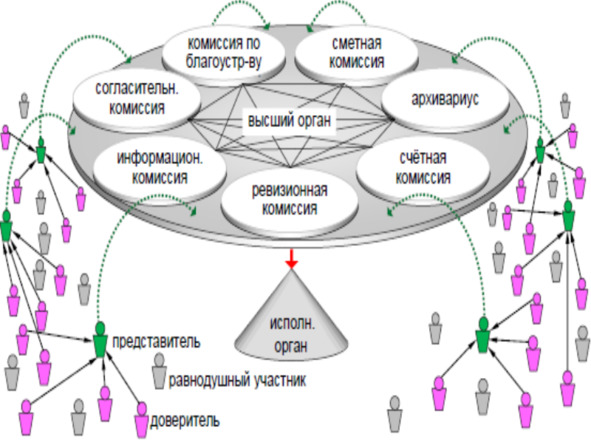 Высший орган сообщества – собрание представителей. Его функции предопределены ролью органа и целями сообщества; их исполняют структурные единицы высшего органа – комиссии. Модель даст устойчивость и естественную смену кадров: