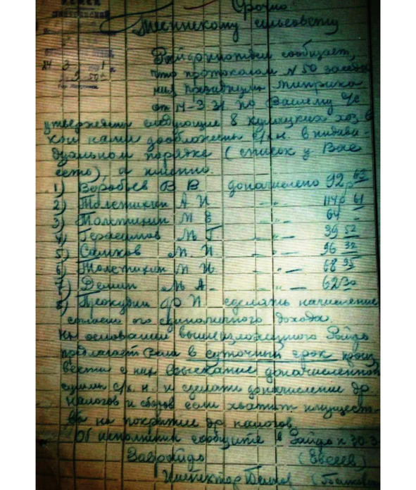 Передо мной музейные материалы по репрессиям 30—40-х: десятки постановлений ЦК ВКП/б, одно страшнее другого, кипы справок, анкет репрессированных… Даже при желании нельзя охватить всё это в одной статье, поэтому выбрала лишь отдельные документы и выдержки из дела N 130, фонд 7 архива музея им. Н. М. Мартьянова4, наиболее ёмко раскрывающие суть репрессий. Это – как бы маленький экскурс в 1930 год, из-за сжатости газетной статьи не претендующий на полноту и всесторонность освещения темы.
