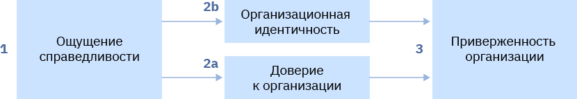 Так, по результатам исследования медицинских сестер Ченьем и соавторами была предложена концептуальная схема формирования организационной приверженности: ощущение справедливости (распределения задач, вознаграждений и т. п.) усиливает доверие к организации и идентичность с организацией, что, в свою очередь, усиливает организационную приверженность. Упрощенное схематическое отображение [модель упрощена авторами монографии, в числе прочего из модели исключены проверяемые авторами статьи гипотезы] их подхода представлено на рис. 1[55].