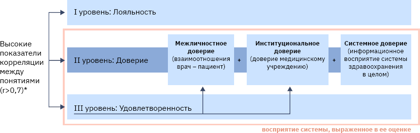 Рисунок 2. Соотношение понятий «удовлетворенность», «доверие», «лояльность». Под звездочкой приведен коэффициент корреляции между лояльностью и удовлетворенностью, по данным исследований ГБУ «НИИОЗММ ДЗМ»[57]