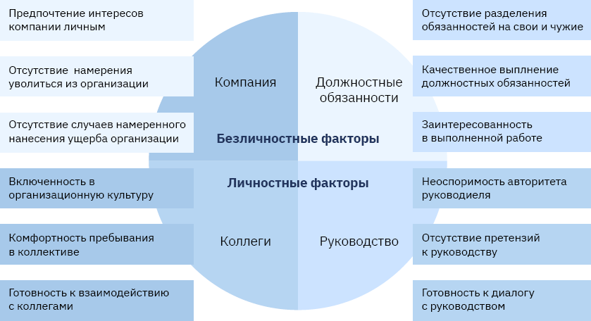 Факторы лояльности включают в себя как организационные, так и персональные факторы. Для удобства восприятия при изложении факторы поделены на две эти группы, однако ввиду сложности дифференциации между ними следует сразу оговориться, что такое разделение во многом условно, так как многие факторы включают как внешний компонент (влияние организации), так и внутренний (реакцию на него сотрудника/группы персонала).