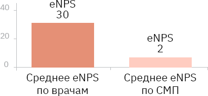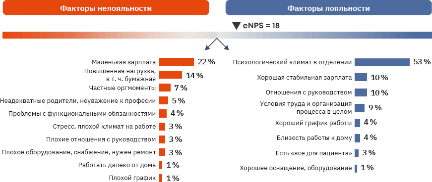 Другой негативный аспект – то, что, несмотря на положительные тенденции, пандемия и в случае инфекционной службы не нивелировала существенный должностной «раскол» по критерию лояльности: средний eNPS врачей в обеих больницах составил 47,7, среднего медперсонала – 6,3.