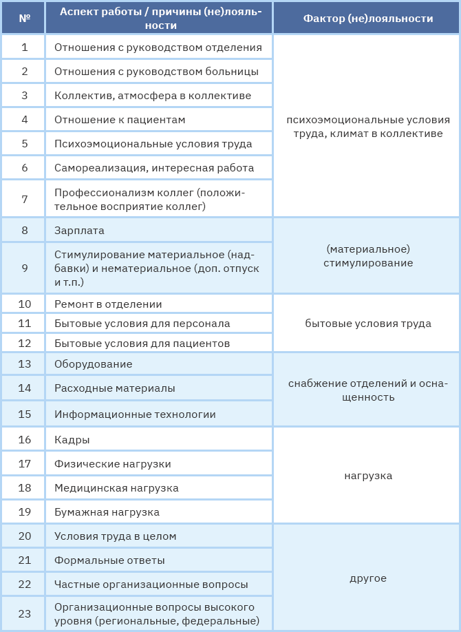 Таблица 3. Группировка причин (не)лояльности персонала многопрофильного стационара