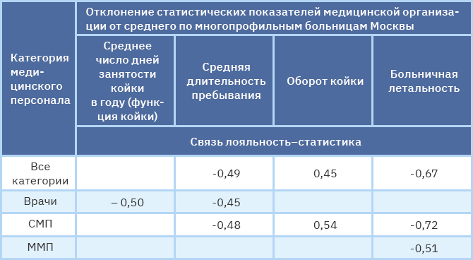 Таблица 4. Связь лояльность—статистика в многопрофильном стационаре. Приведены только корреляции от 0,45 по модулю и выше.