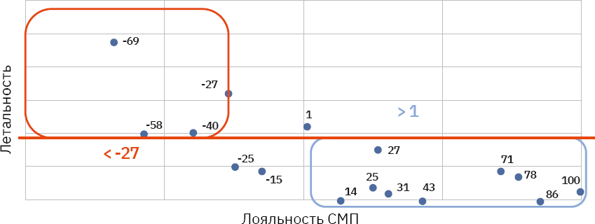 Рисунок 12. Лояльность СМП и больничная летальность.