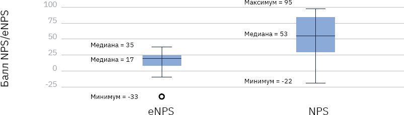 Рисунок 13. Диаграмма размаха по показателям NPS и eNPS по всем проанализированным исследованиям.