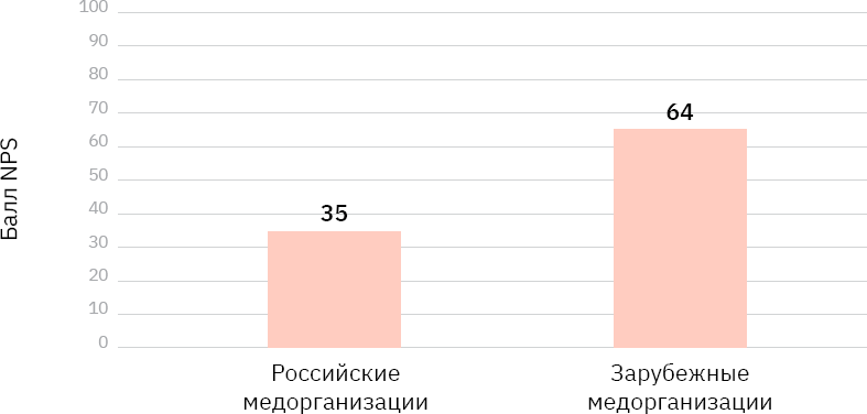 Показатель NPS как характеристика лояльности пациентов был рассмотрен в 10 зарубежных и 17 российских кейсах. Среднее значение показателя (медиана) по зарубежным исследованиям составило NPS=64, по российским NPS=35 (Рисунок 14). В связи с достаточно выраженными различиями при определении референтных значений, для конкретной российской медорганизации рекомендуется ориентироваться в первую очередь на результаты отечественных исследований.
