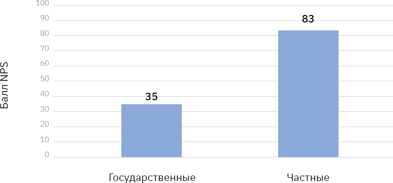 Рисунок 15. Сравнение медиан NPS по частным и государственным медицинским учреждениям.