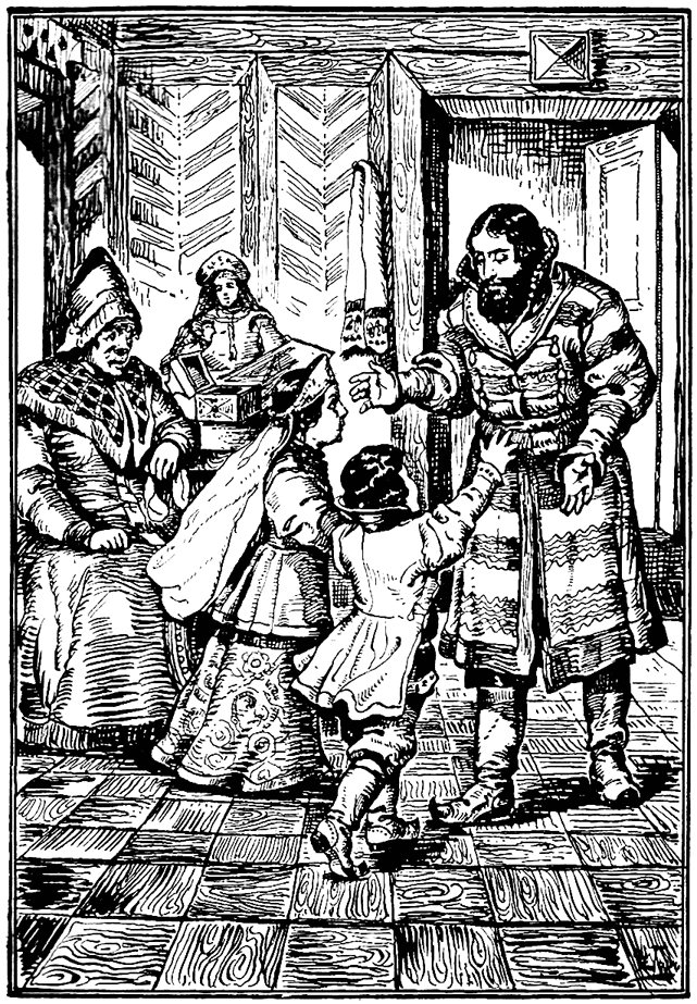 Гости боярыни Ксении тоже разъехались по домам, и теперь в ее просторной передней горнице, кроме нее самой да деток с их мамой-пестуньей Кондратьевной, находились только старая боярыня Шестова, мать молодой Романовой, и золовка ее, красавица Настя, жившая на Романовском подворье. Лишь только плечистая рослая фигура боярина Феодора Никитича показалась в дверях, Таня и Миша с веселым криком бросились навстречу отцу.