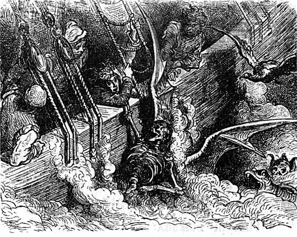 Вдруг шкипер приказал: «Ложиться в дрейф». Ужас Панурга был неописуем. Он предлагал всем дать какой-нибудь обет, совершить большое паломничество. «Каждый подумай о своей душе!.. Надеяться можно лишь на помощь небесного чуда!» Даже Пантагрюэль пришел в волнение.