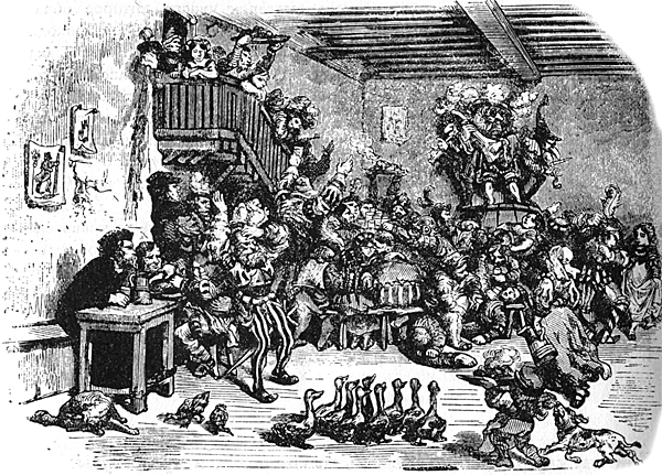 Пока мы таким образом беседовали, вышел большой Фляга, губернатор Божественной Бутылки, в сопровождении стражи храма, которая вся состояла из Французских Бутылочек. Заметив, что мы все с тирсами в руках (как я сказал) и увенчаны плющом, а также узнав нашего знатного Фонаря, он нас пропустил в полной безопасности и приказал, чтобы нас отвели прямо к принцессе Бакбюк – придворной даме Бутылки и верховной жрице при всех мистериях. Это и было сделано.