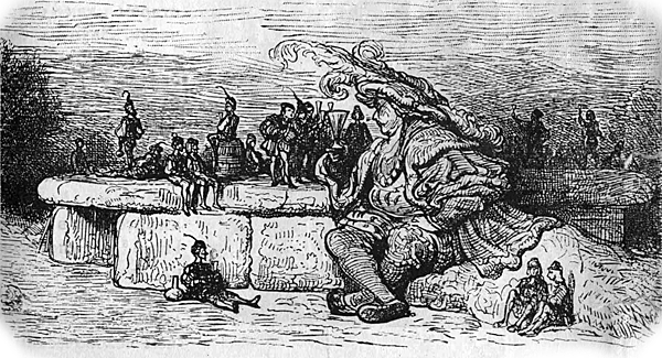 И вот однажды он взял да отломил от большой скалы, называвшейся Паслурдэн, камень в двенадцать квадратных туазов и толщиной в четырнадцать ампанов и свободно положил его на четыре подпорки среди поля, чтобы школьники, когда им нечего было делать, могли забраться на этот камень с бутылками, ветчиной и пирожками и пировать и вырезать ножиком свои имена на камне. Камень этот и сейчас называют «Вознесенным Камнем». В память этого события, никто не вносится в матрикулы университета в Пуатье, пока не напьется из Конского источника в Крустель, не пройдет по Паслурдэну и не слазает на «Вознесенный Камень».