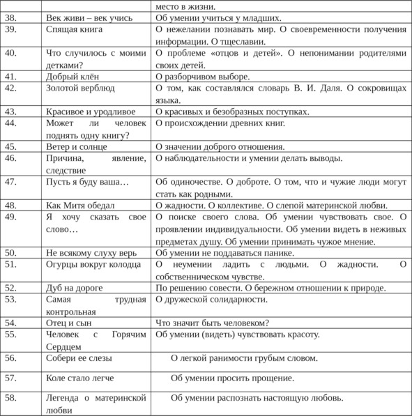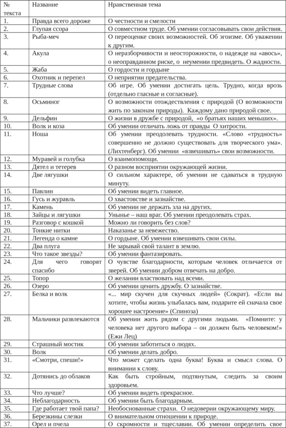 Чтобы показать направленность содержания произведений приведу переречень нравстенной тематики текстов.