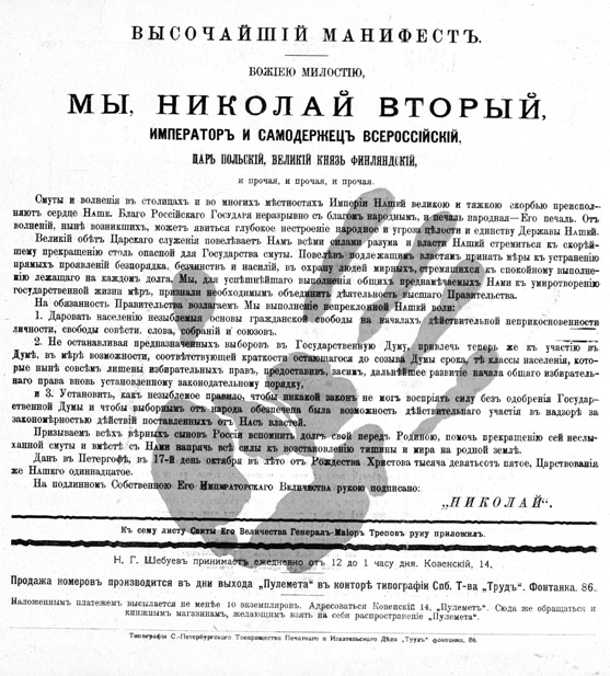Революционные изменения в политическом и социальном строе великой страны, как правило, обусловлены крупными метаморфозами в системе общественных отношений и упадком старых государственных институтов. Так было и в России в начале XX в. Вместе с тем, определяющее влияние на ход событий всегда оказывал субъективный фактор, а именно – поведение разных движущих сил и главных действующих лиц исторического процесса. Действия правительства в период острого системного кризиса могут иметь решающее значение. Есть немало примеров, когда продуманные, смелые и последовательные действия первых лиц государства способствовали укреплению власти и ее авторитета, предотвращали или устраняли катастрофические последствия внутренних катаклизмов, а также позволяли качественно модернизировать государственный и общественный строй. Такими примерами могут служить великие преобразования Петра I и Екатерины II, а также обновление государственных институтов Империи при Александре I. В свою очередь, бесстрашие Николая I 14 декабря 1825 г., «эмансипация» крепостных и других подневольных сословий при Александре II, решительные шаги по преодолению «кризиса самодержавия» в начале царствования Александра III дали возможность не только уберечь Россию от внутренней смуты и упрочить монархическим режим, но и раскрыть сохранявшийся у него созидательный потенциал.