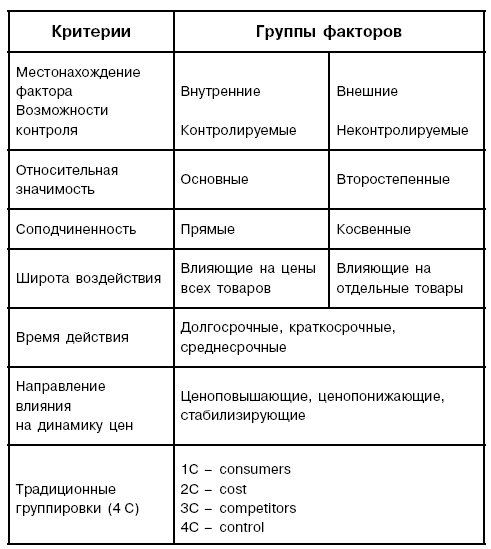 Наиболее общая группировка ценообразующих факторов предполагает их разделение по критерию положения относительно самой компании и возможностей контроля с ее стороны. С этой точки зрения все факторы можно разделить на внутренние и внешние, влияние на которые со стороны компании ограничено. Это один из способов структуризации материала и на уровне учебников маркетинга [Котлер, Армстронг, Сондерс, Вонг, 1998, гл. 16].
