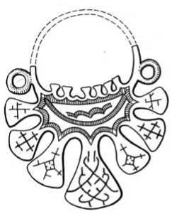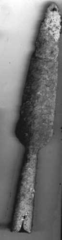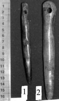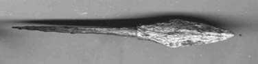 общая длина – 13,7 мм; ширина у основания – 11,8 мм; ширина средней части – 14 мм; ширина у острия – 7,2 мм; отверстие диаметра – 4,3 мм; толщина у острия – 3,5 мм толщина средней части – 8 мм; толщина у задней части – 8 мм;