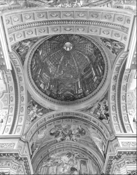 Можете выйти на улицу и убедиться, что крыша плоская. Ну не хватило денег. Поэтому купол нарисованный, совсем как очаг в каморке папы Карло из сказки про Пиноккио. Папой Карло церкви Святого Игнатия в 1685 году был Андреа Поццо, разумеется тоже иезуит, а главное – математик. Именно благодаря точным расчетам художнику удалось создать эту удивительную иллюзию, за что он и получил лестное прозвище «Микеланджело перспективы». Прекрасные фрески в кафедре и апсиде тоже его работа, но даже они меркнут по сравнению с куполом, которого нет.