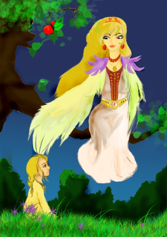 Разлетелась кубышка в руках девочки, точно разодранная царапками Василинки подушечка, на мелкие-мелкие пёрышки, обсыпав белизной лоскутное одеяло, словно снегом. Внезапно за окном зазвучало чарующее сладкозвучное пение. Выделилось из волшебного белого покрова печи одно перо, самое большое со сверкающей золотой окантовкой. Поднялось оно вверх и медленно поплыло по воздуху в сторону окна на мелодичный зов. Наткнувшись на стеклянное препятствие, перо стало бесшумно ударятся о прозрачную поверхность, как бы вырываясь на свободу. Завороженная Полинка шла за пером. Открыв окно, она выпрыгнула в палисадник и села в цветнике под яблоньку, куда оно опустилось. Сверху послышался приближающийся звук хлопающих крыльев. В спящие цветы спустился дух прекрасной светлолицей девицы в белых одеждах с золотым поясом и короной на голове, вместо рук её были лебединые крылья. Льняные волосы струились по плечам, груди и спине. Из очей её лился огонь. Не отрывая глаз, смотрела Полинка на птицедеву.
