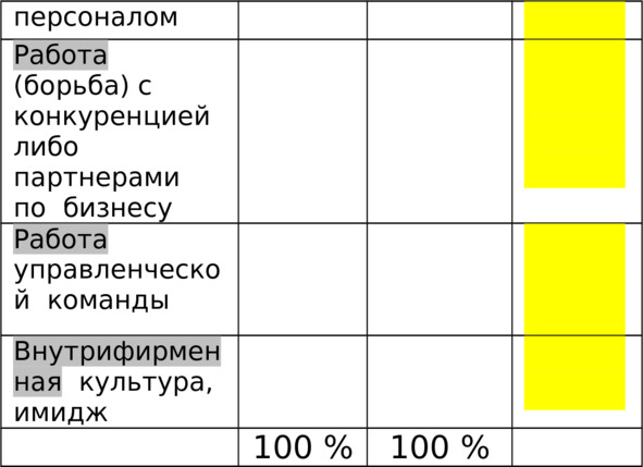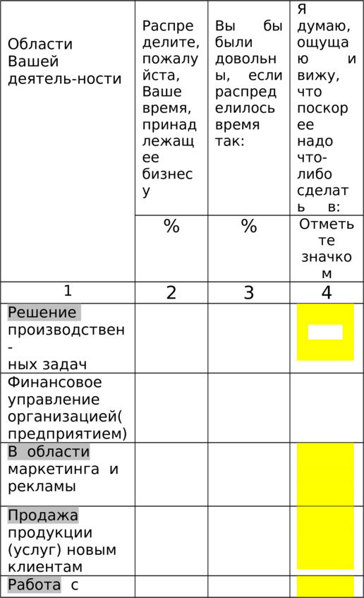 Отмеченные области Вашей деятельности в графе №4 на выделенном фоне относятся в консалтинге к области менеджмента, который способен обеспечить их инновациями, решениями проблем.