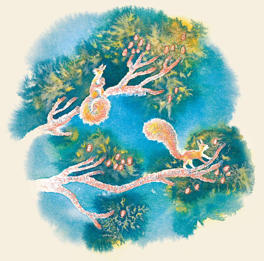 И верно. Вскоре я заметил на деревьях сразу несколько белок. Они с шумом носились друг за дружкой с ветки на ветку и вверх-вниз по стволам, выписывая спирали и пируэты, подобно заправским акробатам, а может, даже лучше. Движения белок были невероятно быстры и точны. Ни одна из них ни разу не сорвалась, не упала на землю. При этом белки успевали всё время о чём-то своём болтать, что-то верещать и насвистывать. Видно было, что им здорово весело.