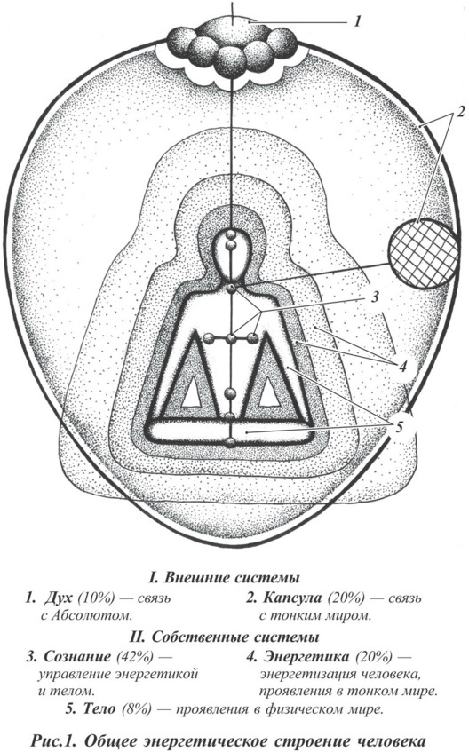 Поэтому цель данного параграфа – описать принципиальное строение человека на энергетическом уровне, определить назначение его основных частей и правила взаимодействия между ними. Это также необходимо для определения роли сознания в жизнедеятельности человека и для понимания основных механизмов воздействия на него тонкого мира.