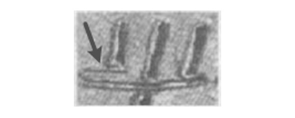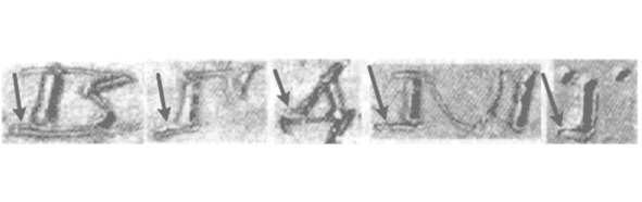 Прорисовка нижнего ограничителя в графике данной буквы более чем примечательна, ведь он мог просто совпасть с горизонтальным элементом буквы. Так эту букву было бы проще нарисовать, но писарь упорно продолжал показывать ограничитель отдельно, отрывая левый вертикальный элемент буквы от горизонтального. Подобный отрыв не наблюдается ни у среднего, ни у правого вертикального элемента ни в одном изображении букв. Если в графике какой-то буквы присутствуют два вертикальных элемента, то нижний ограничитель может присутствовать только у левого из них. В случае если буква занимает всю ширину матрицы, то не будет его и у правого вертикального элемента: