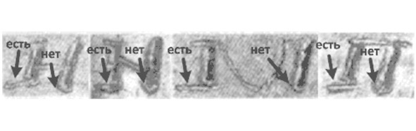 С обозначением всех направляющих матрицы мы определились, и нам осталось только правильно их расположить: какие из них необходимо соотнести с ее вертикальными направляющими, а какие с горизонтальными, и в каком порядке они должны следовать. В этом нам помогут сами изображения букв. В их графике обнаружились замечательные особенности, которые последовательно и в полном объеме встречаются только в «Новгородском кодексе». Применительно к вертикальным элементам буквы это нижний ограничитель левой линии буквы (показан стрелкой на примере букв В, Г, Д, М и Ї) (Рис. 9).