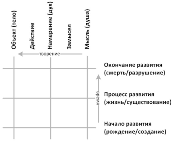 По нашему мнению, буква – это графическое изображение, передающее нам, как и любое другое изображение, образ какого-то объекта или явления на определенном уровне абстракции. Как сообщают ученые, финикийские буквы произошли от пиктограмм, изображавших конкретные объекты: «алеф» – голова быка, «бет» – дом и так далее. Вследствие изобретения фонетического алфавита эти изображения перестали соотноситься людьми с родительскими понятиями, а стали обозначать только звуки, на которые начинались соответствующие слова. У нас нет причин не доверять выводам историков, но буквы-то от этого не перестали быть изображениями и не могли полностью потерять свой графический смысл. Оттого, что люди перестали их соотносить с конкретными объектами, сами изображения некогда конкретных объектов никуда не делись. Изображение не может быть полностью бессмысленным, ведь оно обязательно олицетворяет какой-то образ8, даже если это просто точка или линия. Иначе изображение просто не существовало бы. Изображение обязательно передает нам образ чего-то. Выявленная нами графическая матрица букв – тоже изображение, поэтому можно предположить, что и она соотносится с каким-то объектом материального мира. Письменная форма языка (а наша матрица служит основой именно для ее простейших элементов – букв) одинаково используется нами для описания всего, что только возможно ей описать, поэтому выделить для сравнения с нашей матрицей какой-то конкретный объект не представляется возможным. Это должен быть какой-то универсальный образ, параметры которого были бы применимы к любому объекту окружающего нас мира. Такими объединяющими любые объекты параметрами, по нашему мнению, являются время существования объекта и формы его существования, которые в конкретный момент времени у любого объекта окружающего нас мира в каком-то виде обязательно присутствуют. Время существования объекта применительно к объектам неживой и живой природы имеет два крайних состояния: момент создания/рождения и момент разрушения/смерти, а между ними лежит, собственно, сам период существования/жизни объекта.