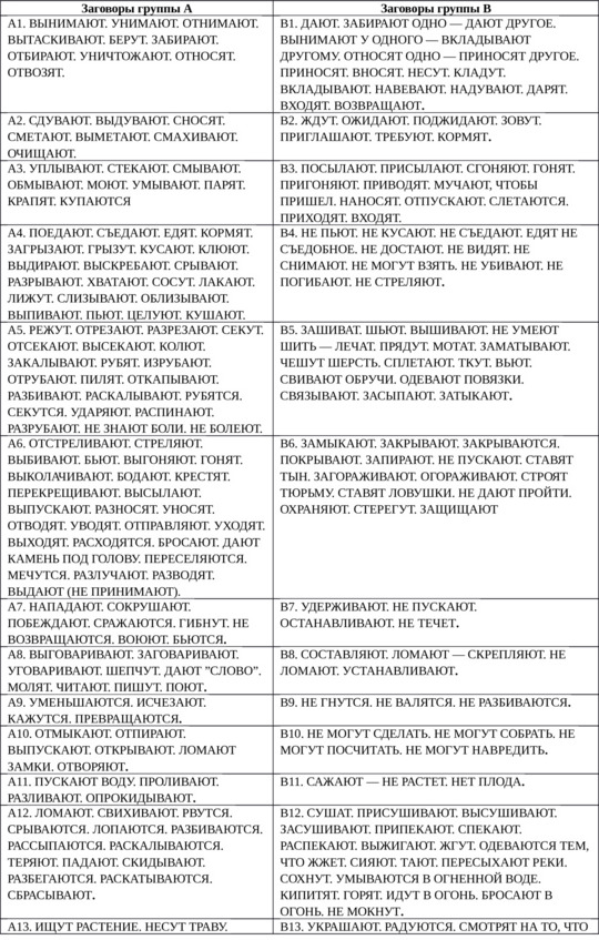В основу своей классификации заговоров В.Л.Кляус положил факт разделения самими носителями заговоров на «черные» и «белые». «Это «народное» деление восходит к одной из основных культурных оппозиций: добро/зло, – утверждает автор. – В центре заговорной поэзии… находятся человек и его жизнь, поэтому, действительно, все заговорные тексты можно выделить в две группы по признакам «нанесение зла» и «уничтожение зла» (или иначе – «отнятие» и возвращение добра)». Основываясь на том, что во всех заговоров самым важным являются действия персонажей, В.Л.Кляус разделил все заговоры на две группы: А и В. «Для первой (A) группы характерно направление действий, которое в самом общем значении можно обозначить как «уничтожение», для второй (B) – «созидание» [5].